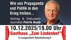 ![]() | Dziennikarz Patrik Baab - Wykład i Dyskusja w Weißenfels: Jak propaganda i polityka popychają nas do wojny10 grudnia 2025 roku Ruch Pokoju w Weißenfels oraz Towarzystwo Historyczne „Erinnern & Gedenken e.V.” zapraszają na wyjątkowy wieczór.... Czytaj dalej |