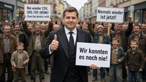 | CDU-Ministerpräsident Sven Schulze empfiehlt: Nie wieder CDU, SPD, FDP und Grüne wählen!Was für ein Auftritt. Was für Worte. Was für eine Bühne. Sven Schulze (CDU-Ministerpräsident) steht im Zentrallager der Tafel, nickt anerkennend, spricht von „Mitmenschlichkeit“, von „Zusammenhalt“, von... zum Artikel |