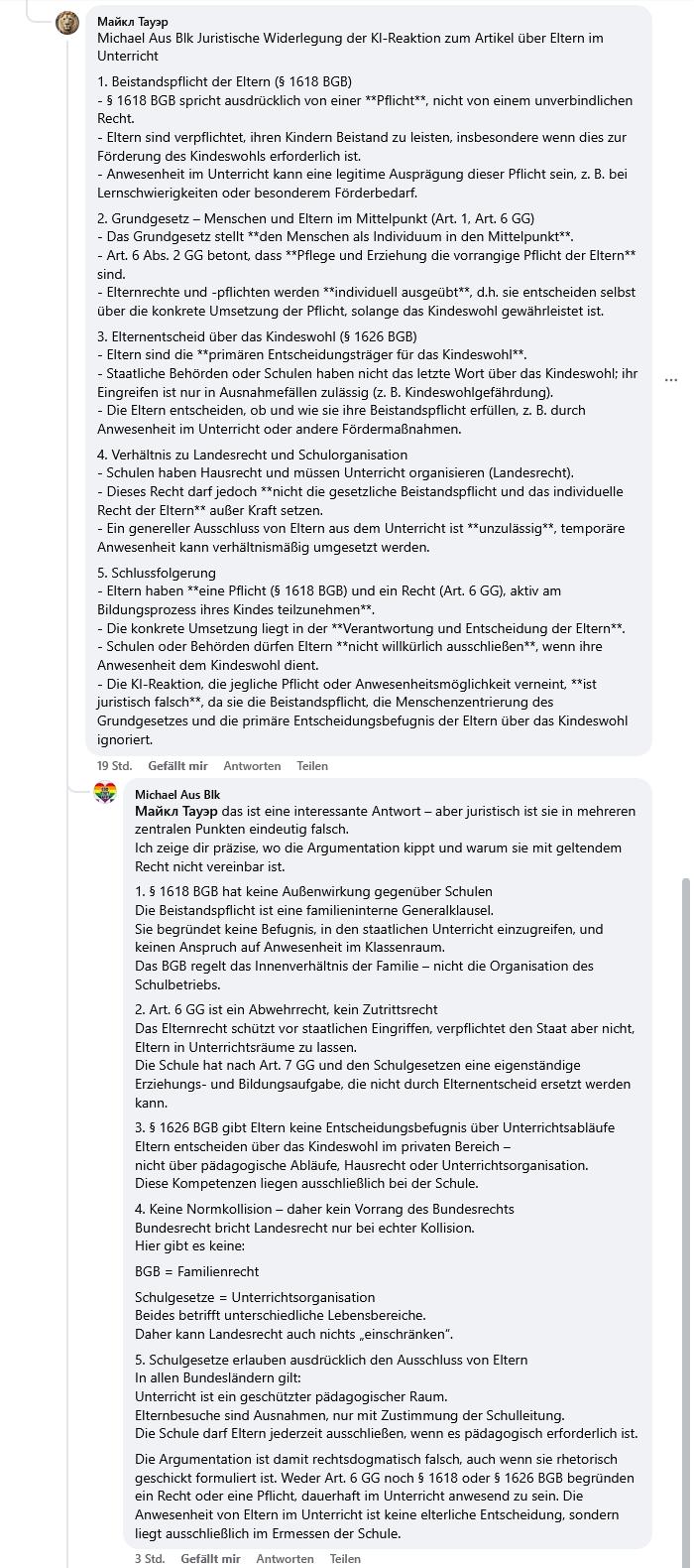 Sorgulamayı öğrenmiş veya benimsemiş olanlar için, bazı kişilerin “Sınıfta ebeveynler, okul ziyareti destek yükümlülüğüdür – Kukulau Senaryosu: Ebeveynler çocuklarıyla birlikte öğreniyor” makalesine verdikleri tepkiler oldukça şaşırtıcıdır. Çünkü burada profil resmini Pride bayrağı renkleriyle süsleyen ve sınıfta ebeveynlerin bulunmasına büyük bir sorun gören bir “Michael aus Blk” var. Garip bir şekilde, söz konusu makalenin bağlantısı yayınlandıktan kısa bir süre sonra birçok Facebook grubunda yorum yapma özelliği devre dışı bırakıldı. Bu konunun geniş çapta tartışılmasını istemedikleri izlenimi veriyor. “Michael aus Blk” için, ebeveynlerin okulda ve sınıfta çocuklarıyla ilgilenmesi korkunç bir durumdur. Korkusunu desteklemek için bir yapay zekayı (YZ) görevlendirdi. Ancak YZ ve kendisi, makalede belirtilen senaryonun şimdilik elbette kurgu olduğunu ve ama yine de mümkün olabileceğini anlamamış görünüyor. Evet, böyle konular her açıdan tartışılabilir ve “3 avukat, 5 fikir!” ilkesinin geçerli olduğu söylenebilir. Ancak, 10 yılı aşkın sürede, okul ziyareti ebeveynlerin destek yükümlülükleri kapsamında olmadığına dair yargısal bir tespit elde etmek için birçok dava açtım. Çünkü aksi durumda, Burgenlandkreis Sosyal Ofisi, Saksonya-Anhalt eyaleti adına, ebeveynler veya akrabaları entegrasyon yardım faaliyetini yürütmek istediklerinde kızım için entegrasyon yardımı finansmanını reddedemezdi. Üstelik bu, kişilerin hangi güvenilir kişinin entegrasyon yardımını yürüteceğini kendilerinin seçememesi nedeniyle özbelirlenim hakkının kısıtlanmasıdır. Ayrıca, aynı entegrasyon yardımı için bu akrabaların ücret almayacak olması, dünya genelindeki diğer herkesin aynı görev için maaş alacak olmasına kıyasla çocuklar ve engelli kişiler yakınlarına yönelik bir ayrımcılıktır. Bu yıllar boyunca, okul ziyareti destek yükümlülükleri kapsamına girmediğini açıklayan hiçbir kurum, yetkili makam (okul da dahil) veya mahkeme olmadı. Sosyal Ofisi ve Saksonya-Anhalt eyaletinin görüşü artık yargı tarafından da doğrulanmıştır. Yine de gökkuşağı renkli “Michael aus Blk”, ebeveynlerin sınıfta bulunma yükümlülüğü veya hakkı olmadığı konusunda katı bir inanca sahiptir. Metinlerinden (ya da YZ metinlerinden) anlaşılacağı üzere, okulların ebeveynleri çocuklarıyla ilgili olarak fiilen yetkisiz kılabileceğini düşünüyor. Profil resmiyle çeşitliliği vurgulayan “Michael aus Blk” açıkça Anayasayı tam olarak anlamamış görünüyor. Çünkü Anayasa insanı, bireyi ön plana çıkarır. Bu, Üçüncü Reich’tan çıkarılan derstir: bireyin topluma, “büyük bütüne” yalnızca boyun eğmekle kalmayıp hatta kendini feda etmesi gerekiyordu. Artık bu istenmedi, bu yüzden Anayasa buna göre yapılandırıldı. Sonuç olarak, ebeveynlerin çocuklarıyla ne zaman ve nasıl ilgileneceğine devlet, bir kurum veya yetkili makam karar vermez; nihayetinde karar ebeveynlerindir. Bu nedenle, her zaman bireyselliklerini gökkuşağı renklerinde sergileyen, çok sayıda cinsiyetin olduğunu iddia eden ve kitleden ayrılmak için bireysel zamirlerle hitap edilmek isteyenlerin, sınıfta ebeveyn varlığı konusunda devlete boyun eğmeyi yalnızca talep etmekle kalmayıp, bu boyun eğmeyi şiddetle savunmaları oldukça şaşırtıcıdır. Görünüşe göre, bireysellikten büyük bir korku vardır. “Michael aus Blk” gibi kişiler bu çelişkiyi fark ediyor mu şüphelidir. Bunlar, aynı zamanda Corona önlemlerine boyun eğmeyi talep eden kişilerdi – yani bireyin toplumun korunması için alınan önlemlere uyması gerektiğini, zorunlu aşıya kadar. “My body, my choice” birdenbire önemini yitirdi. Tek tip uyum talep edildi. Daha fazla ebeveyn haklarını kullanıp sınıfta çocuklarıyla ilgilenmeye başladığında geleceğin nasıl olacağı belirsizdir ve sınıfta kaç ebeveynin bulunacağına bağlıdır. Okullar bunu genel olarak engelleyemez, çünkü mevcut yasalarla uyumlu değildir. “My body, my choice!” “Çocuğum, destek yükümlülüğüm, destek hakkım!” Evet, ofislerin ve yetkili makamların tam olarak bu yasal durumu maliyetleri düşürmek ve istatistikleri –senaryoda gösterildiği gibi– güzelleştirmek için kullanması da mümkündür. Aşağıda, çeşitliliği talep eden fakat ebeveynlerin bireysel haklarını sınırlamak isteyen “Michael aus Blk”in Facebook’taki argümanları verilmiştir: Michael Aus Blk a Michael Aus Blk Sınıfta ebeveynler makalesine YZ tepkisinin hukuki çürütmesi Michael Aus Blk Bu ilginç bir cevap – ama hukuken birkaç temel noktada açıkça yanlıştır.